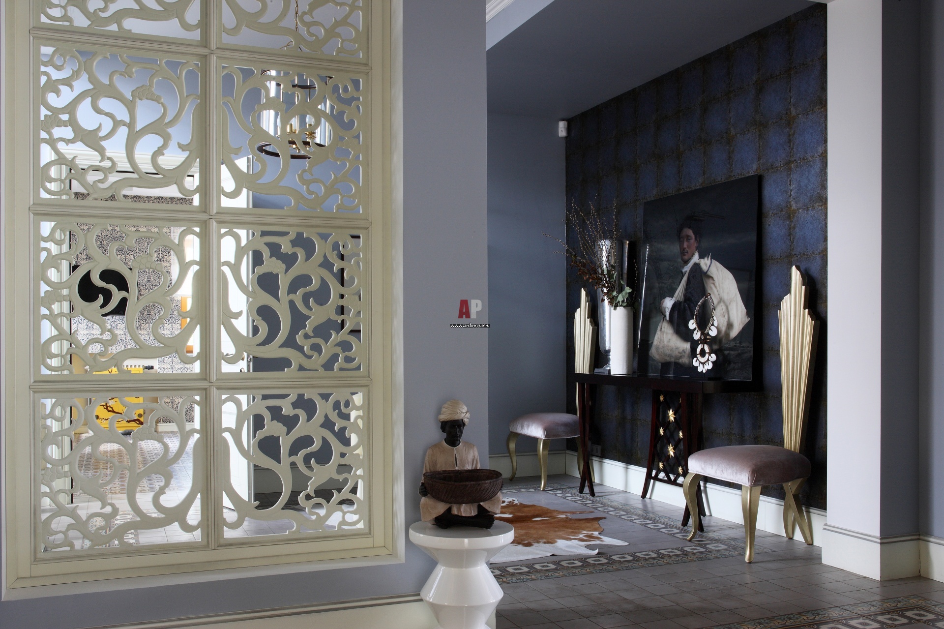 Прихожая и холл выкрашены в цвет питерского неба, краски, Sanderson. Торцевая стена выделена обоями Zoffany, похожими на темно-синие металлические пластины. На ней размещена крупная фоторабота Яна Бина «Тибетский коммерсант».