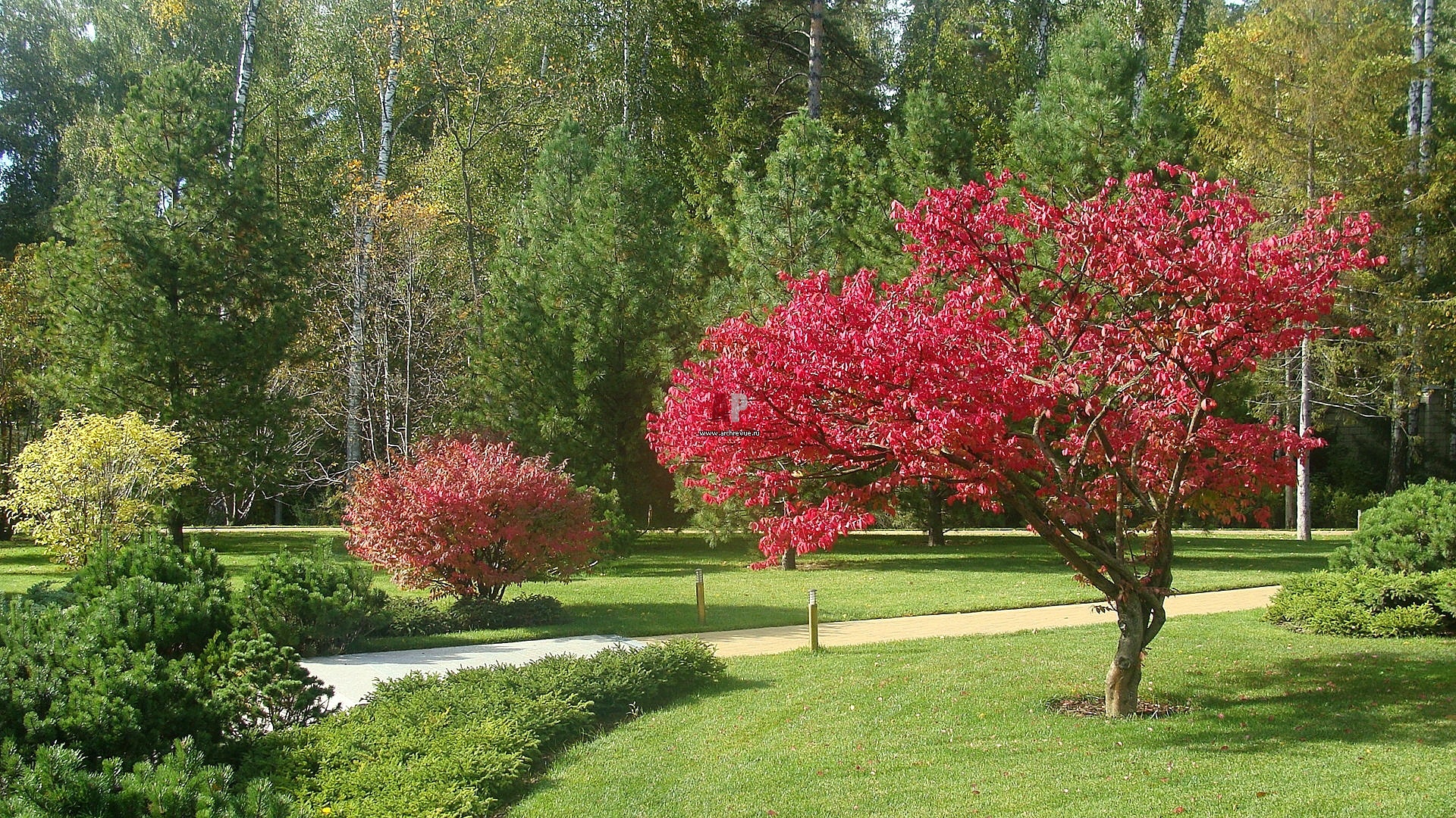 Красный куст зонтичной формы – Бересклет Крылатый. Растение уникально своей формой, высотой (более 3-х метров) и возрастом. Привезено из европейского питомника.