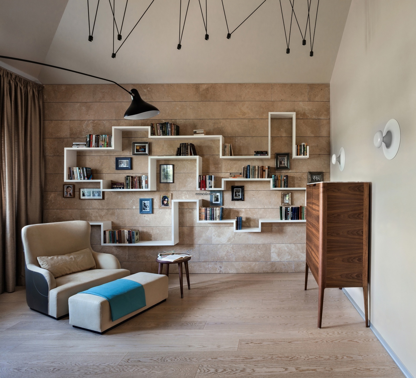 Малая гостиная с библиотекой. Стена за стеллажом Lago оформлена травертином. Кресло, Meridiani. Комод и столик, Porada. Бра и потолочные светильники, Vibia.