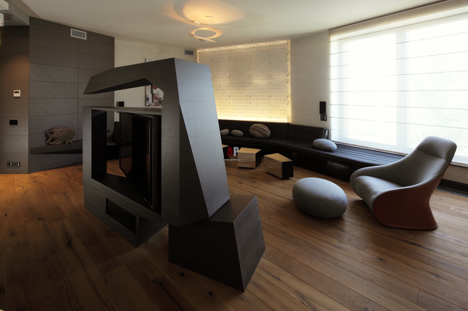 Телевизионная стойка с поворотным экраном визуально разделяет обеденную зону и зону отдыха. Вдоль панорамных окон размещен 9-ти метровый диван от TS Salotti. За ним расположен авторский витраж. Люстра и торшер, Artemide.