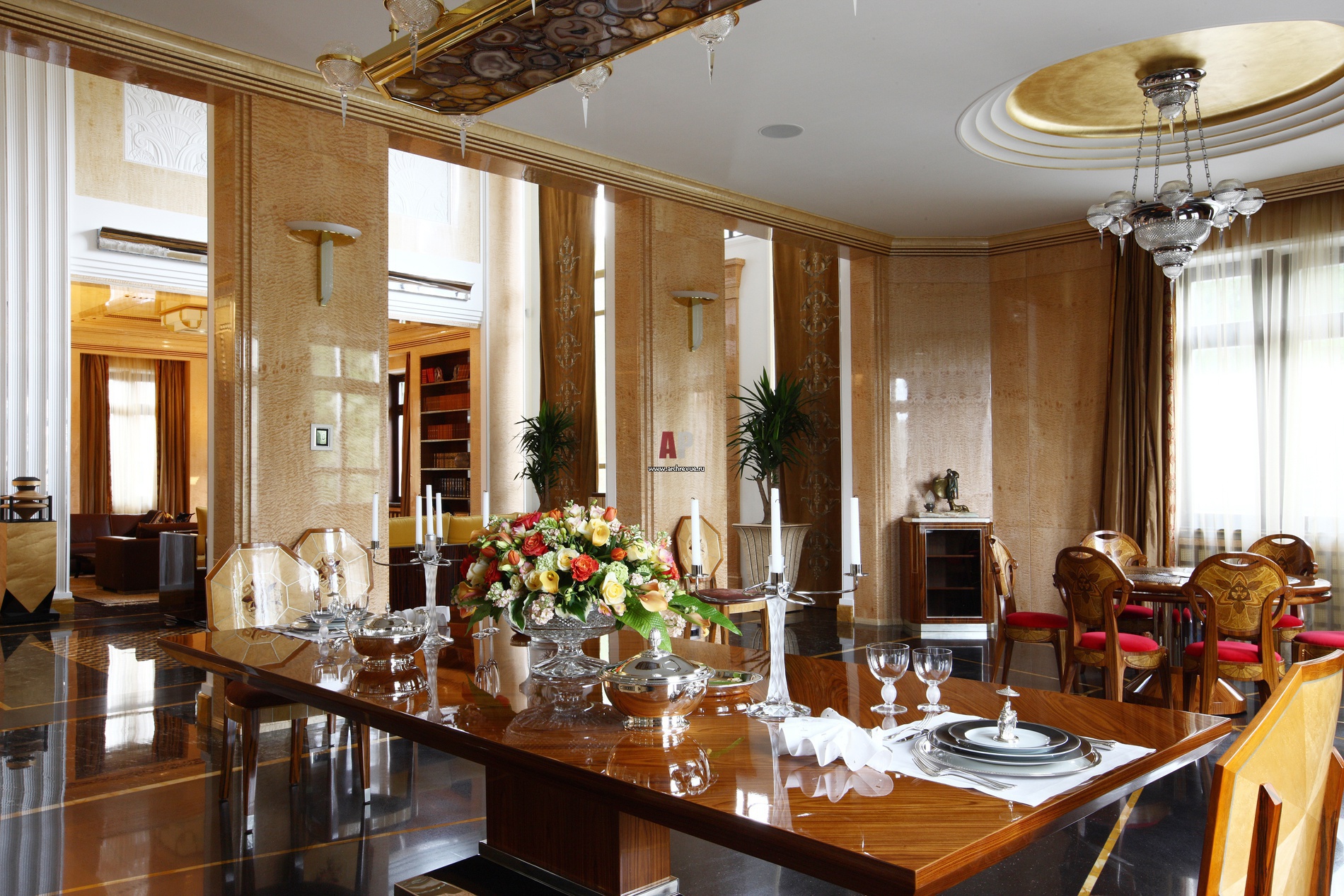В зоне столовой находятся два стола: прямоугольный – обеденный, небольшой, круглый – для карточных игр. Стулья для игрального стола – переосмысленные копии модели начала ХХ века. Сохранив общие очертания, конструкцию стула полностью переработали, он стал более устойчивым и удобным. Декоративный сюжет на деревянной спинке стула выполнен в технике маркетри, с тонкими металлическими прожилками, вставками из кости и перламутра.