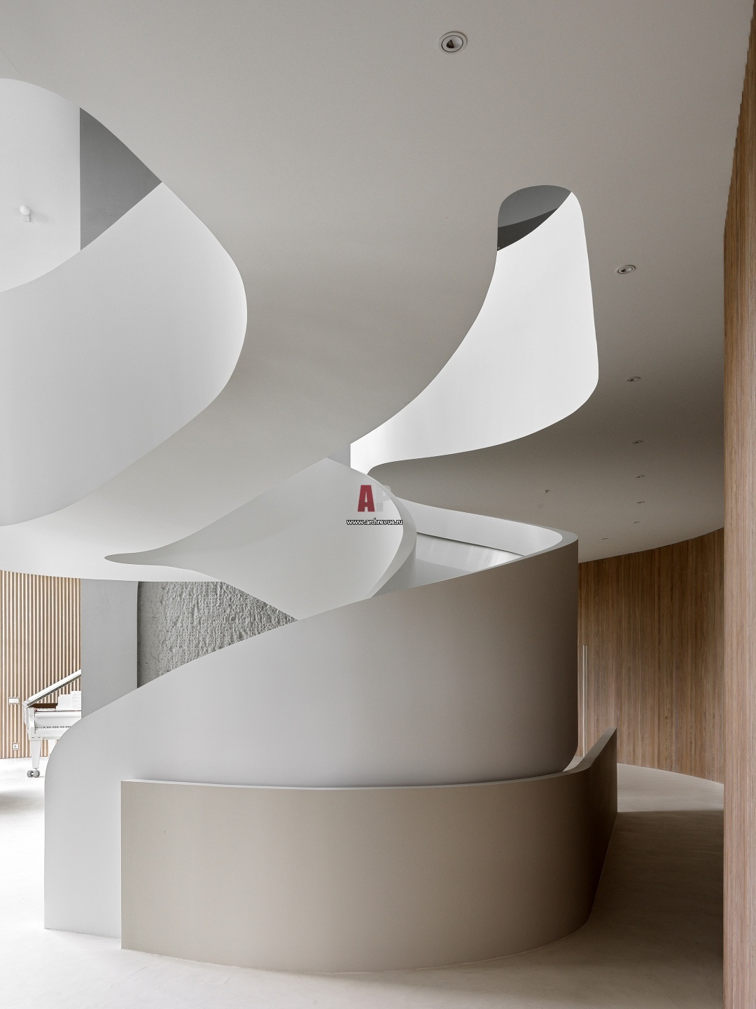 Лестница не просто винтовая, а с несущими перилами и перемычкой-балконом, с которого можно обозревать весь первый этаж.