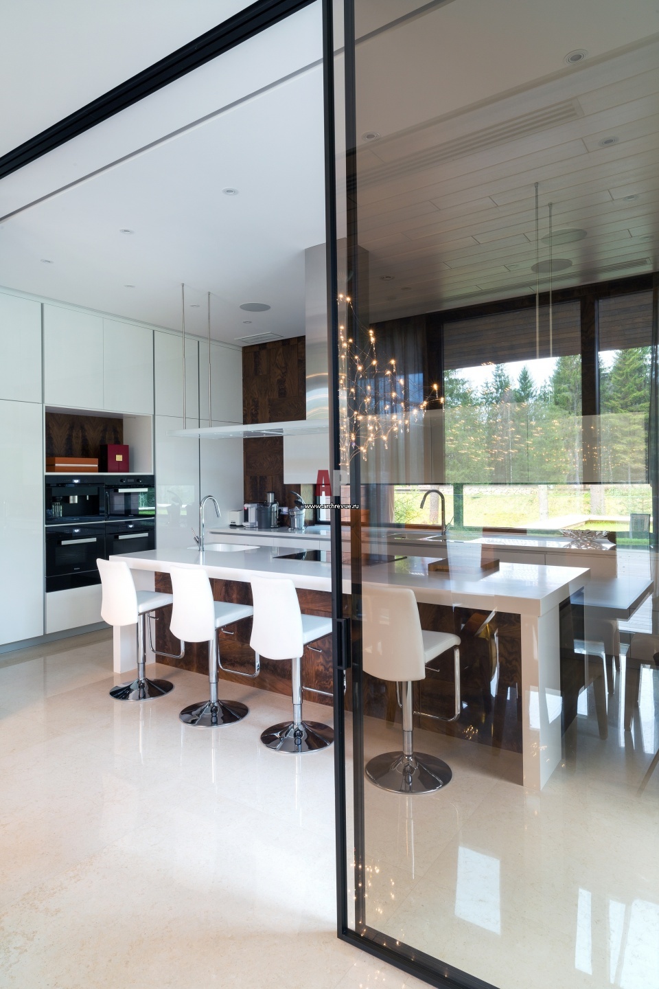 Интерьер современной кухни решен в белом цвете. Пол выложен белым мрамором, кухонный гарнитур исполнен в белом лаке, столешница из белого камня, барные стулья обтянуты белоснежной кожей.