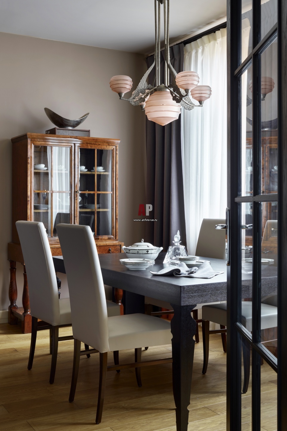 Зона столовой в гостиной. Люстра в стиле ар-деко с плафонами из розового стекла, Франция, 1920-30 гг. Буфет, винтаж, Швеция.