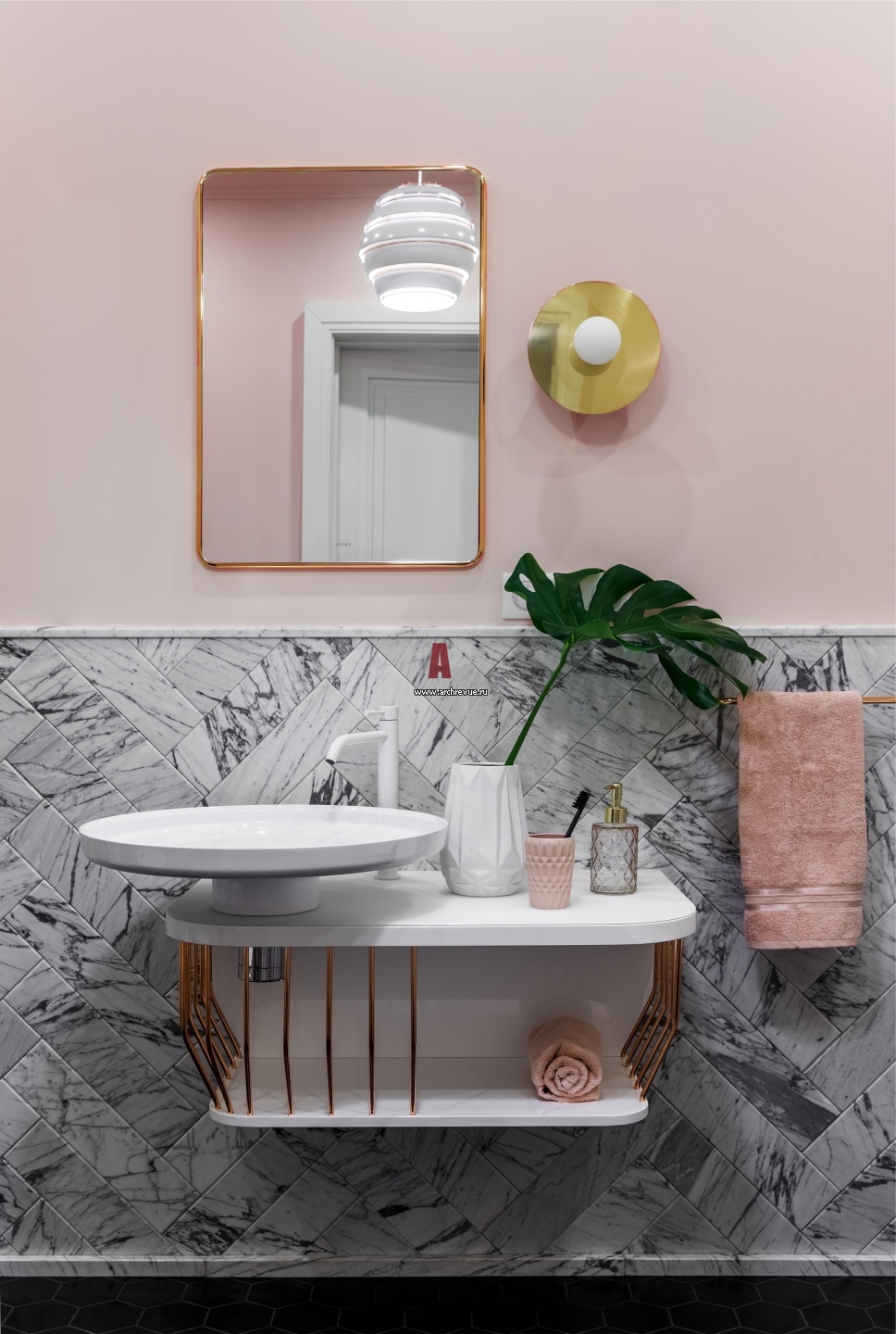 Детская ванная комната. Умывальный стол с металлической решеткой, Inbani, коллекция Bowl. Люстра, Artek. Бра, Areti. Сантехника, Ceramica Cielo. Смесители, Fima Carlo Frattini.