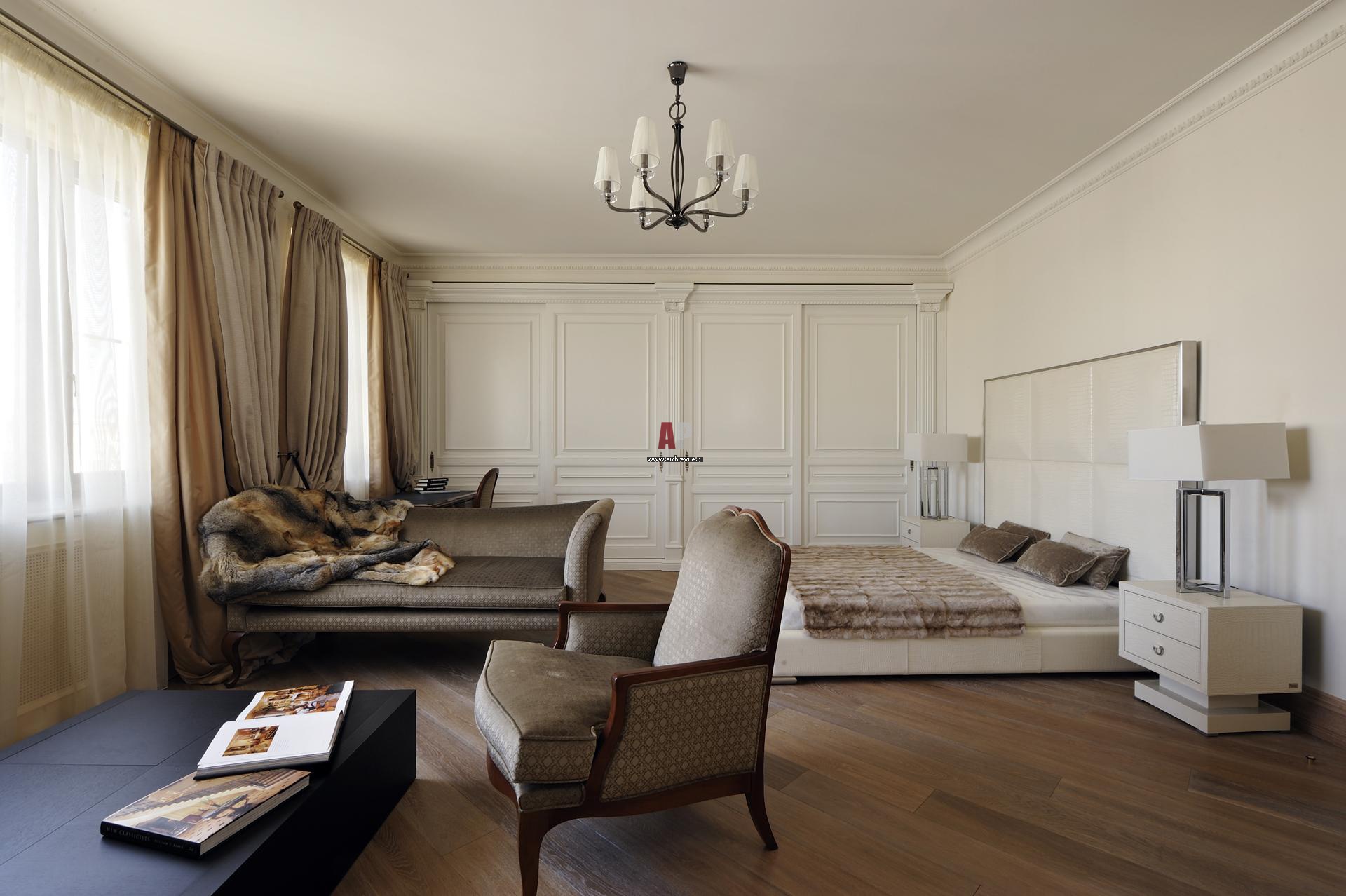 Спальни этой гостевой квартиры оформлены в легком классическом стиле, лишенном излишнего декора. При этом в помещениях есть все необходимое для удобства – встроенные шкафы и даже мягкие зоны