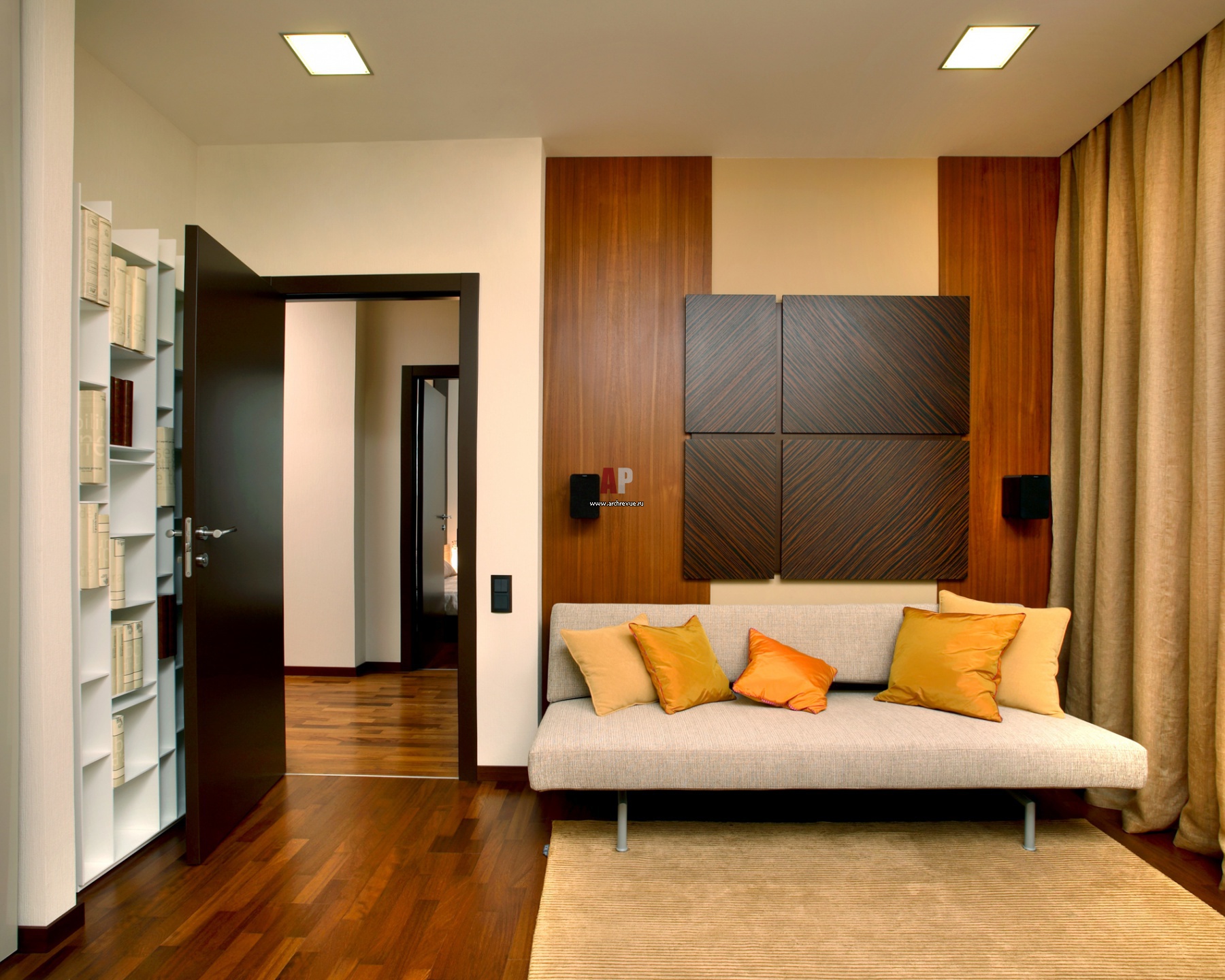 Детская в современном стиле. Над диваном – панно, сложенное из четырех панелей из эбенового дерева. Расположение волокон под разным углом создает интересный геометрический эффект.