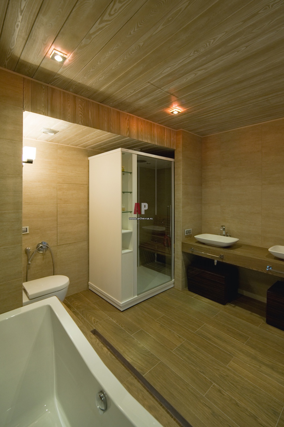 Интерьер современной хозяйской ванной комнаты. В нише расположена сауна.