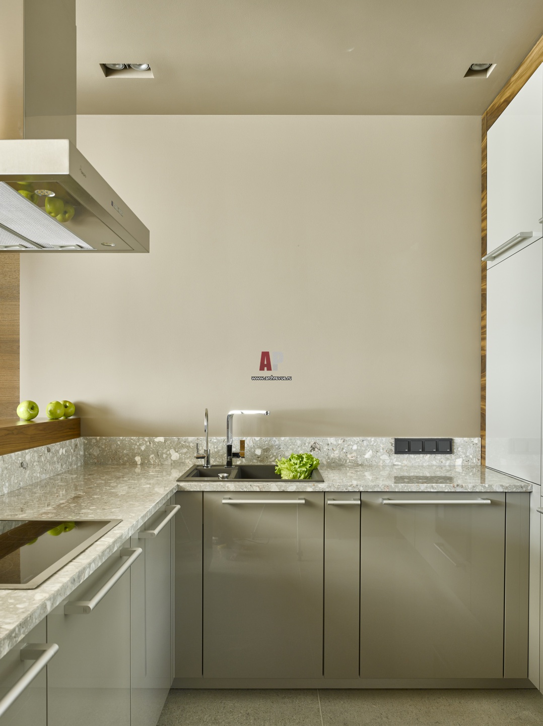 Зона кухни в квартире выходного дня. Кухонный гарнитур, Poggenpohl. Столешница, серый с крупными белыми прожилками мрамор.