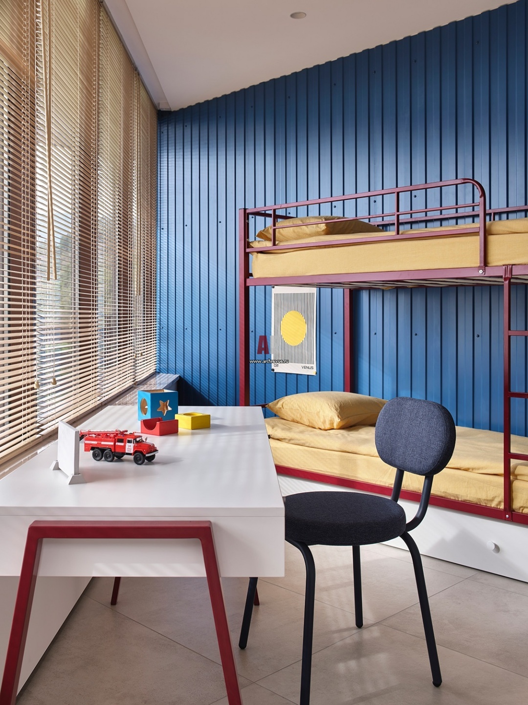 В детской мальчиков акцентом является стена из профлиста, окрашенного в синий цвет. Она является брутальным элементом и служит импровизированной магнитной стеной для игр детей.