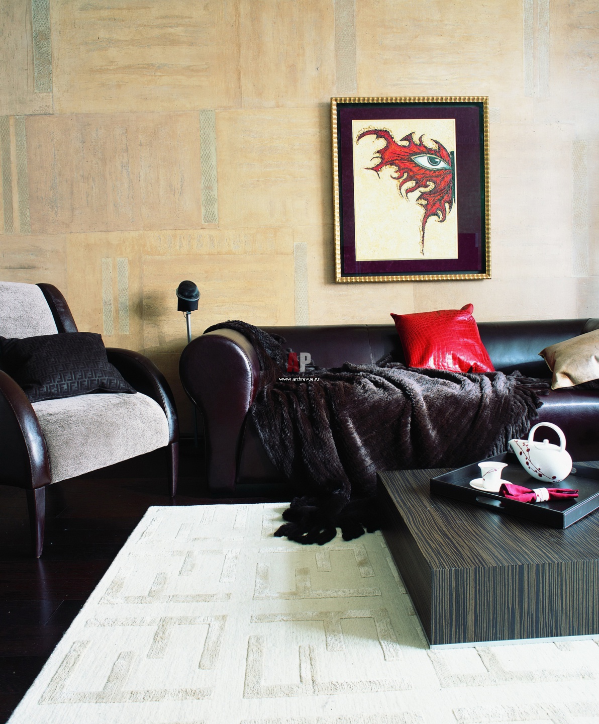 Одна из стен гостиной покрыта сложным финишем песочно-серого цвета с коричневатым оттенком и искусно имитирует натуральный камень. Мебель, ковер, Fendi.