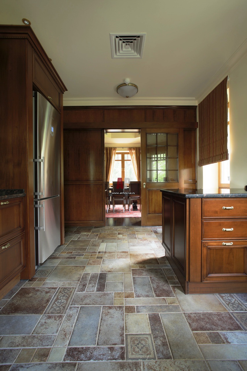 Фото интерьера кухни. Интерьеры дома исполнены в стиле московского модерна с легким акцентом венского сецессиона.