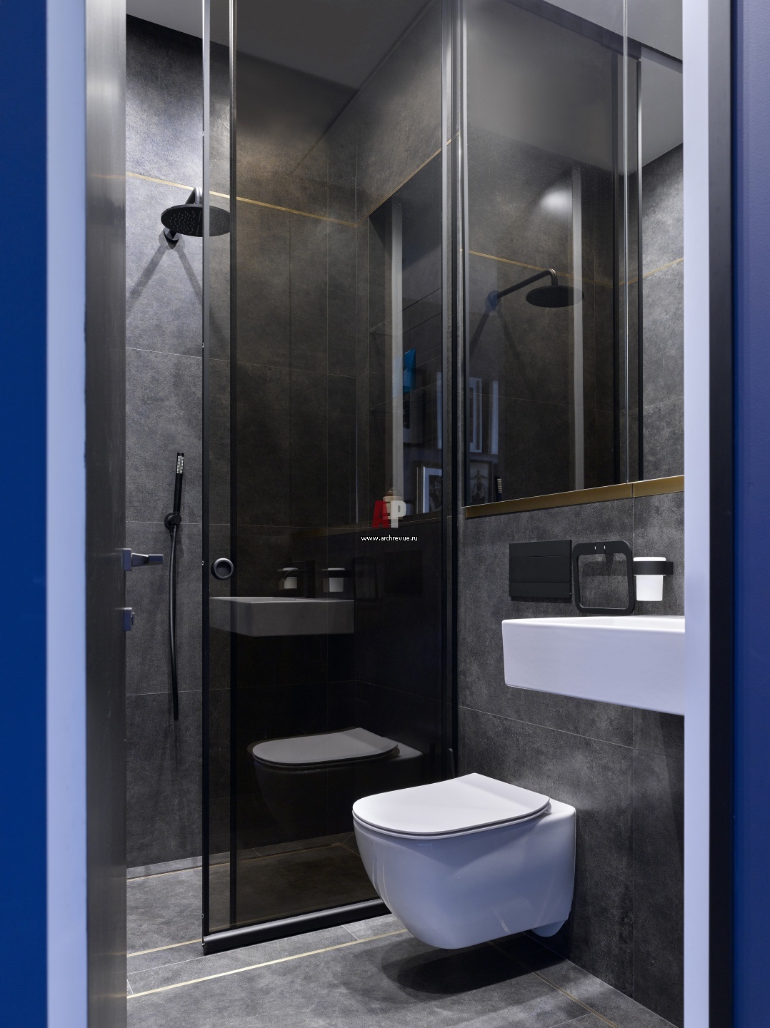 Интерьер санузла при спальне оформлен в плотной палитре. Темные стены и пол – керамогранит, Iris Ceramica with Diesel living. Санфаянс, Ideal Standard. Cмесители, Paffoni.
