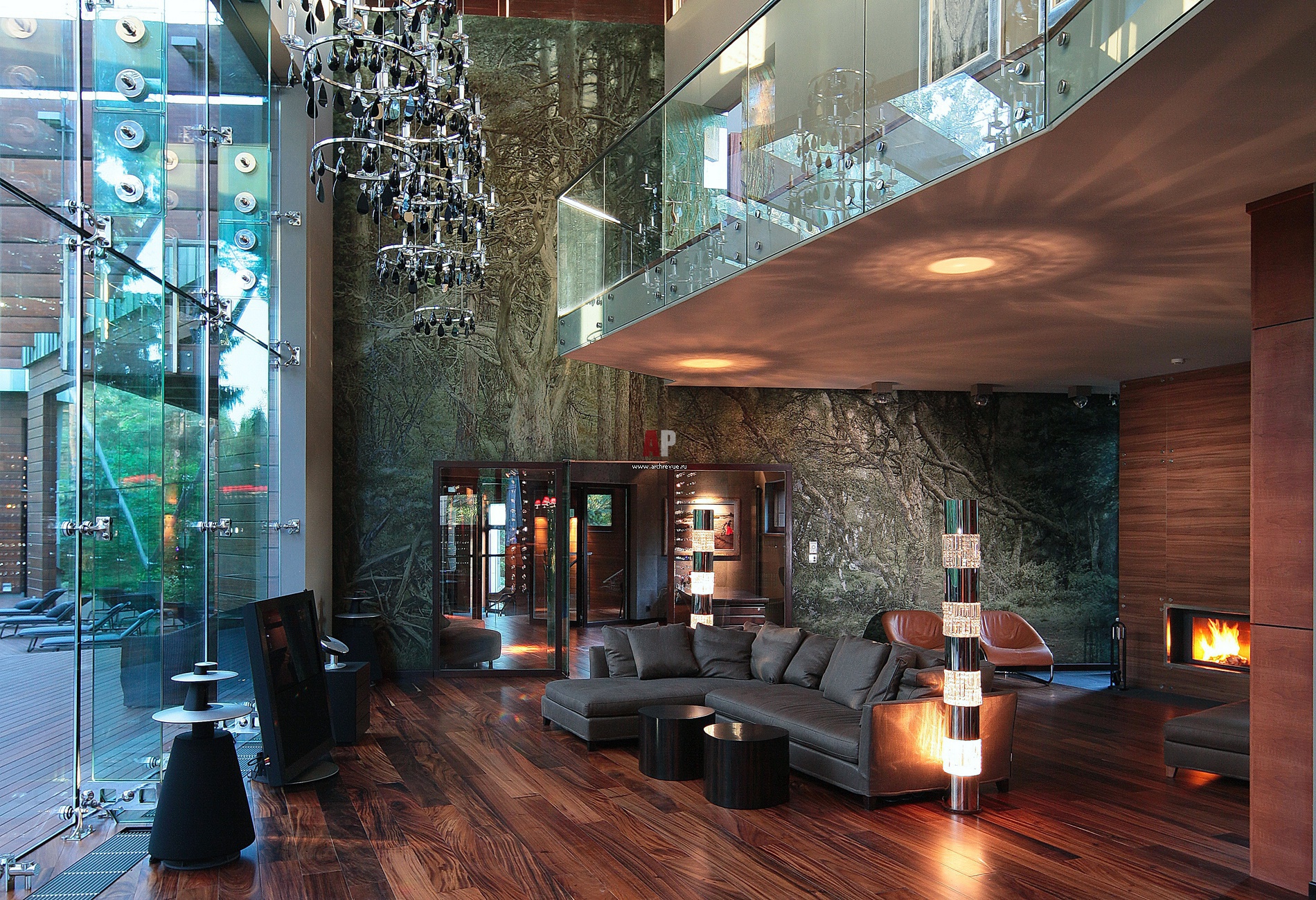 Стена декорирована фотопанно работы художника Валерия Близнюка. На нем изображен фрагмент леса на Соловках. Панно отпечатано на холсте размером 6Х12 метров.
