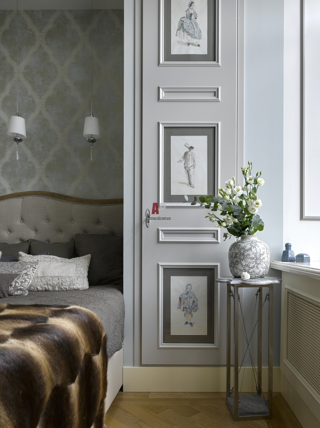 Интерьер спальни. В филенки створок шкафов вставлены акварели с изображением персонажей итальянской комедии: Коломбина, Пьеро, Арлекин.