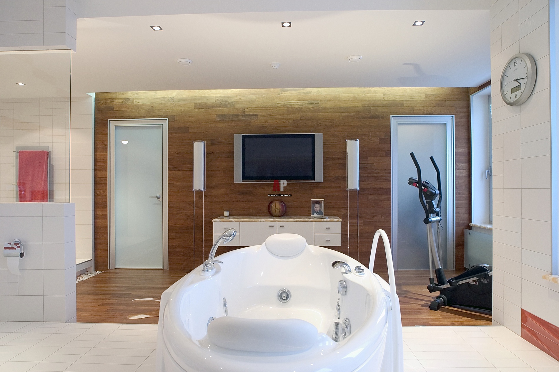 Главная ванная площадью 30 кв. м выполнена в виде многофункциональной комнаты с тренажерной зоной и сауной.