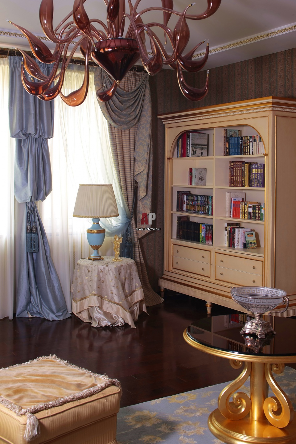 Потолок декорирован деликатным лепным и золоченым кантом. Он придает интерьеру классический облик.