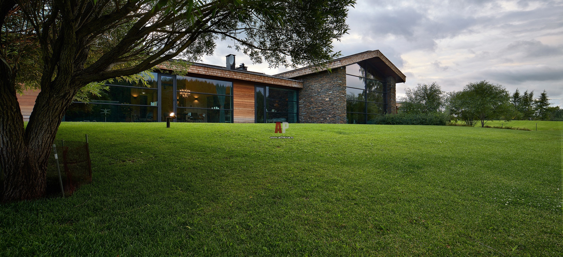 Лиственничная дранка кровли и стены из зеленого сланца растворяют здание в травах и кустарниках рукотворного ландшафта.