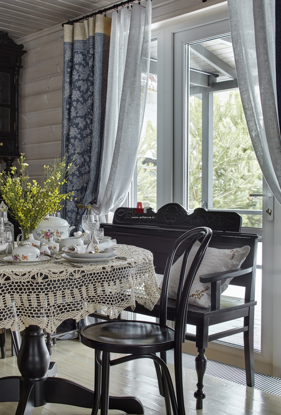 Интерьер столовой в стиле ностальгической старой дачи. Занавески из ивановского льна. Скатерть – плетеное белое кружево. Черный венский стул, Crate and Barrel.