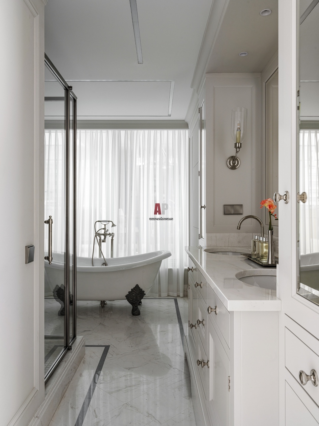 Ванная комната при мастер-спальне оформлена в оттенках экрю. На полу – светлый камень. Умывальник изготовлен на заказ. У окна – ванна «на лапах», Devon & Devon.