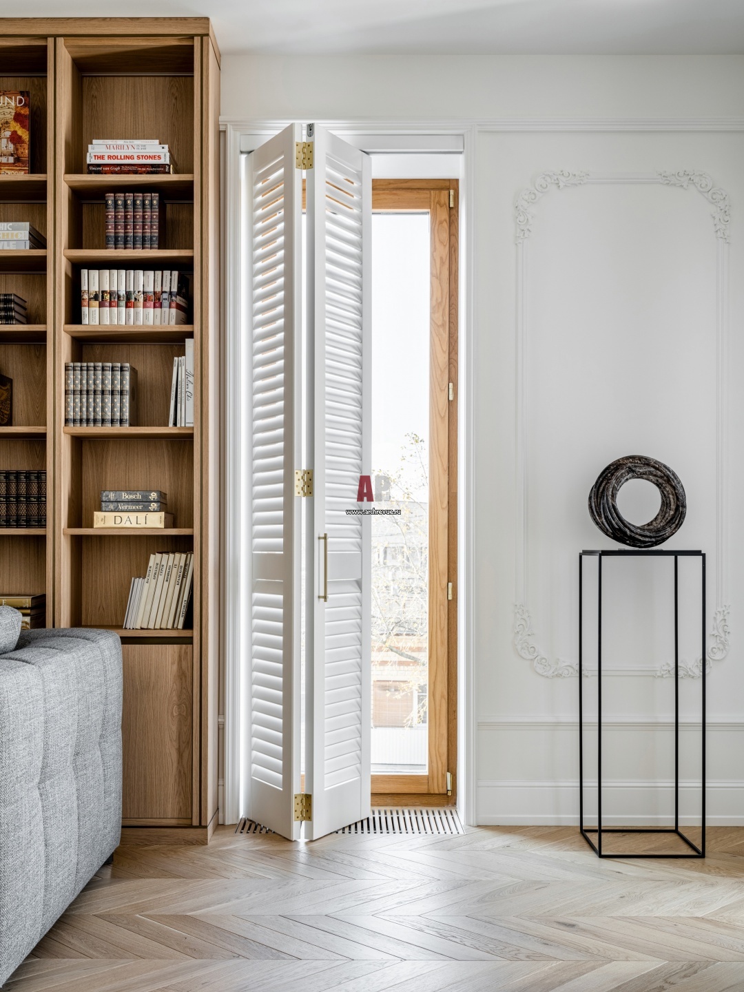 Особенность архитектуры дома – узкие и высокие окна в пол, которые придают современный ритм. Чтобы сохранить свет, воздух и дать ощущение еще большего объема, архитектор предложила использовать белые деревянные ставни-шаттерсы. Скульптура работы Льва Ефимова.