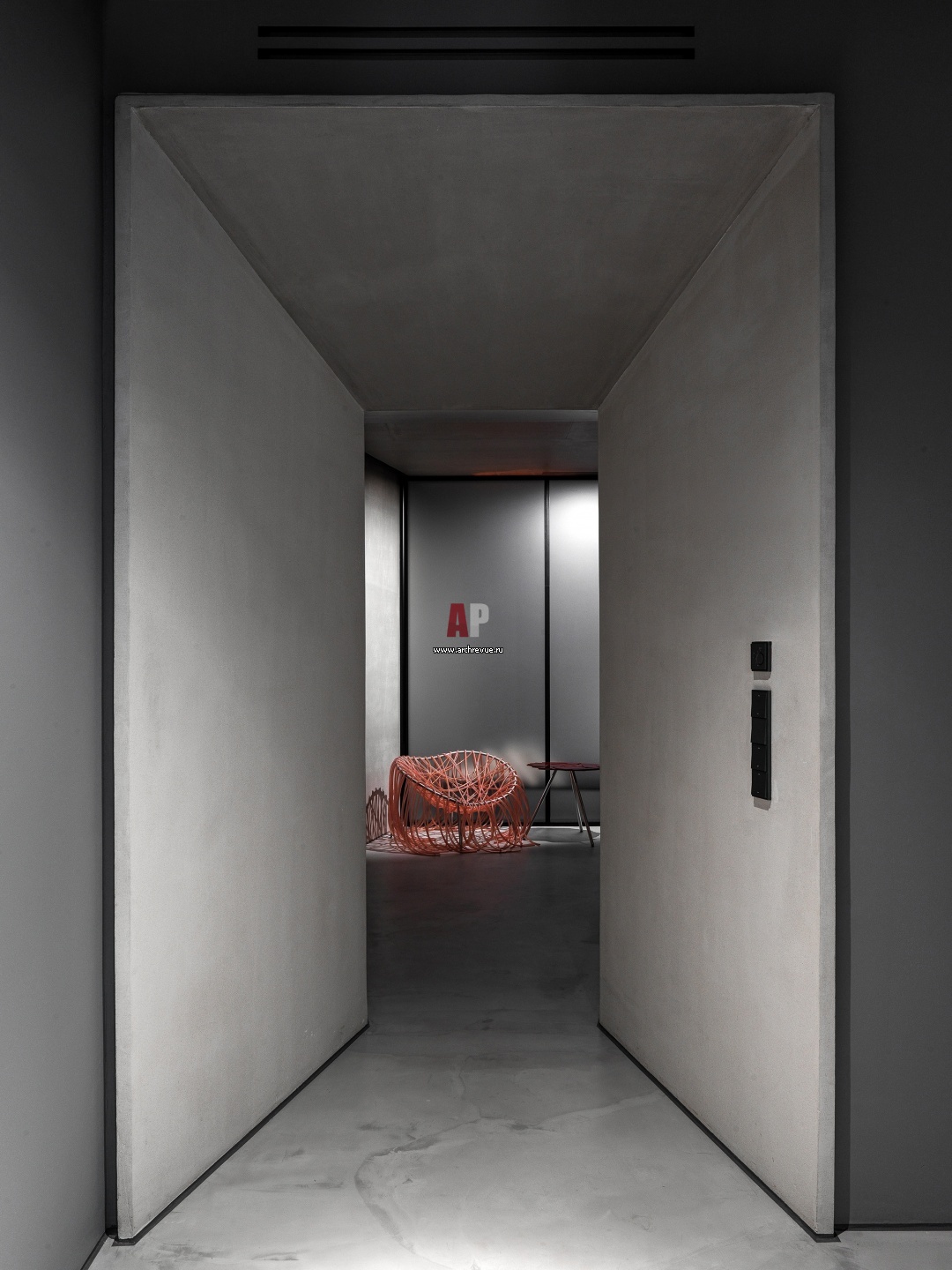 Цокольный этаж с фактурой бетона выглядит еще более брутально чем верхние уровни за счет приглушенного света. Яркий акцент монохромного помещения – коралловое кресло, Edra модель Anemone.