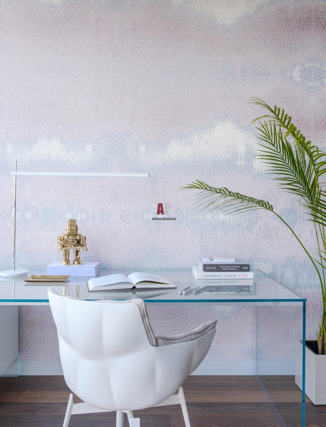 Кабинет в эркере работает на просвет. Прозрачный стеклянный стол Gallotti & Radice, модель Air с низкой тумбой вдоль окна. Стул B&B Italia, модель Husk. Обои с акварельно-пиксельными разводами, Yana Svetlova Wallcoverings.