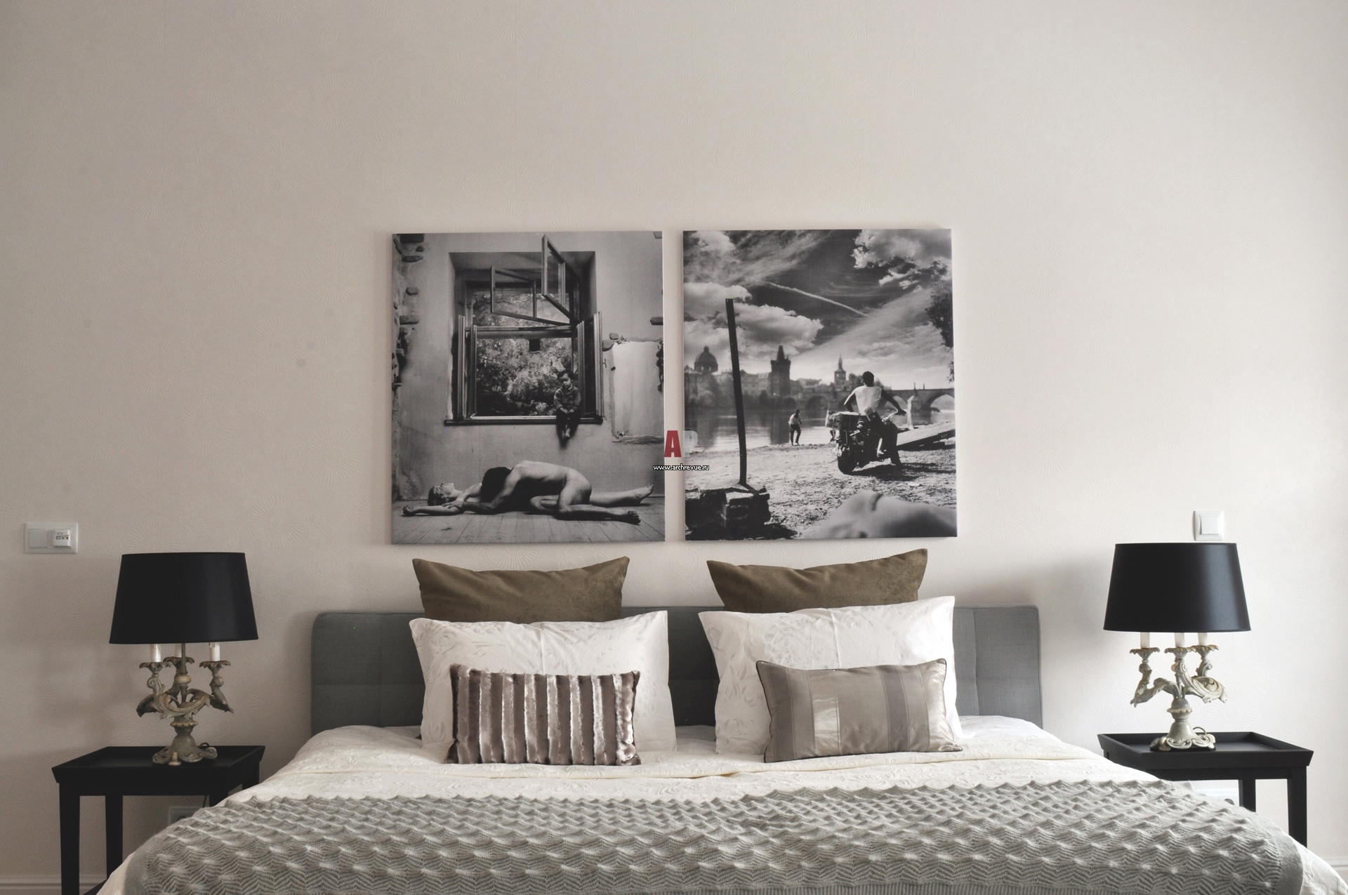 Фрагмент интерьера спальни. Кровать, Zanotta. Над изголовьем кровати – винтажное фотопанно.
