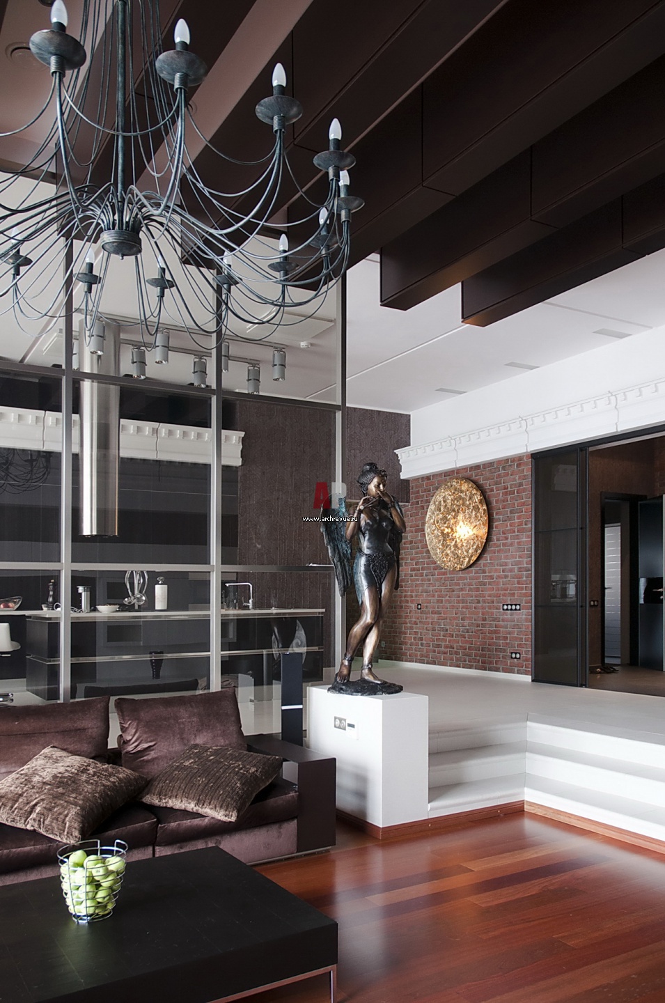 Интерьер гостиной в современном стиле зонирует прозрачная перегородка из тонированного триплекса в алюминиевой раме. Центральный потолочный светильник из черного металла, Orion.