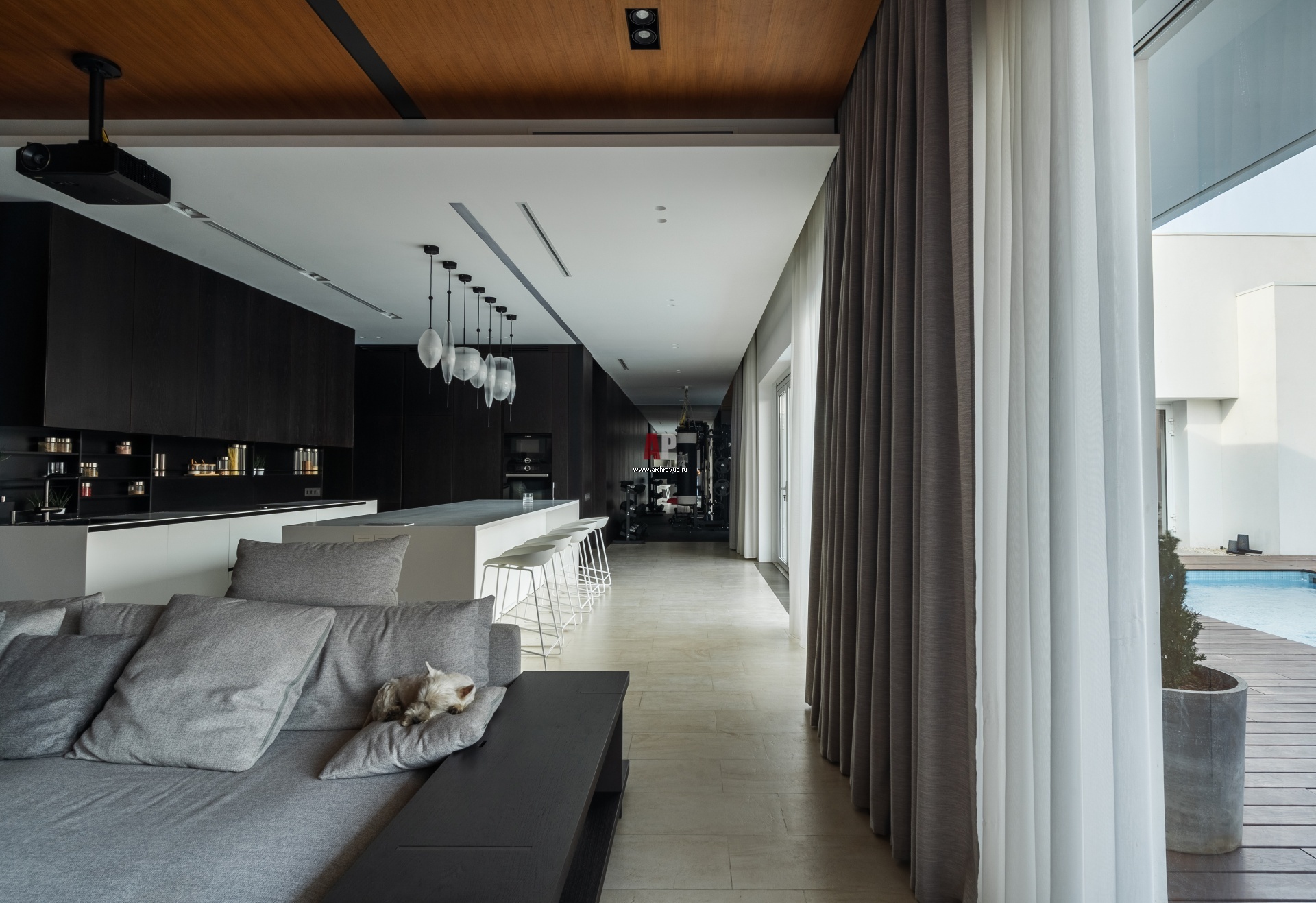 Благодаря Г-образной планировке дома, большая часть окон ориентирована во двор. Кроме того, такая форма дома создает камерное пространство внутреннего двора, а из кухни-гостиной открывается панорамный вид на открытую террасу и бассейн с лаундж зоной. На полу общей зоны – керамогранит, Mirage. На полу приватной части – инженерная доска, Barlinek.