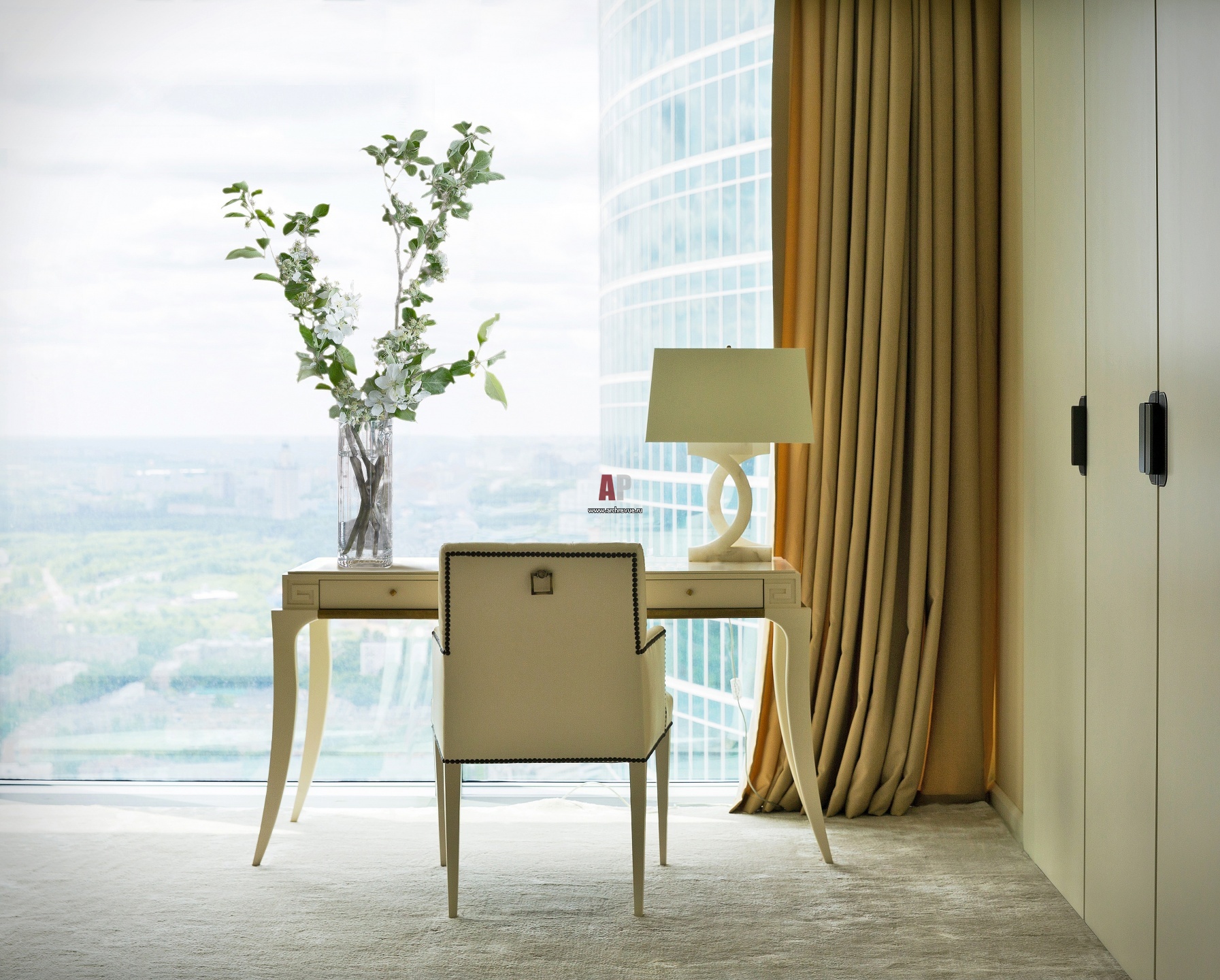 Панорамная квартира в московском небоскребе. Интерьер спальни. Столик, стул и лампа, Baker. Встроенный шкаф цвета слоновой кости, B&B Italia.