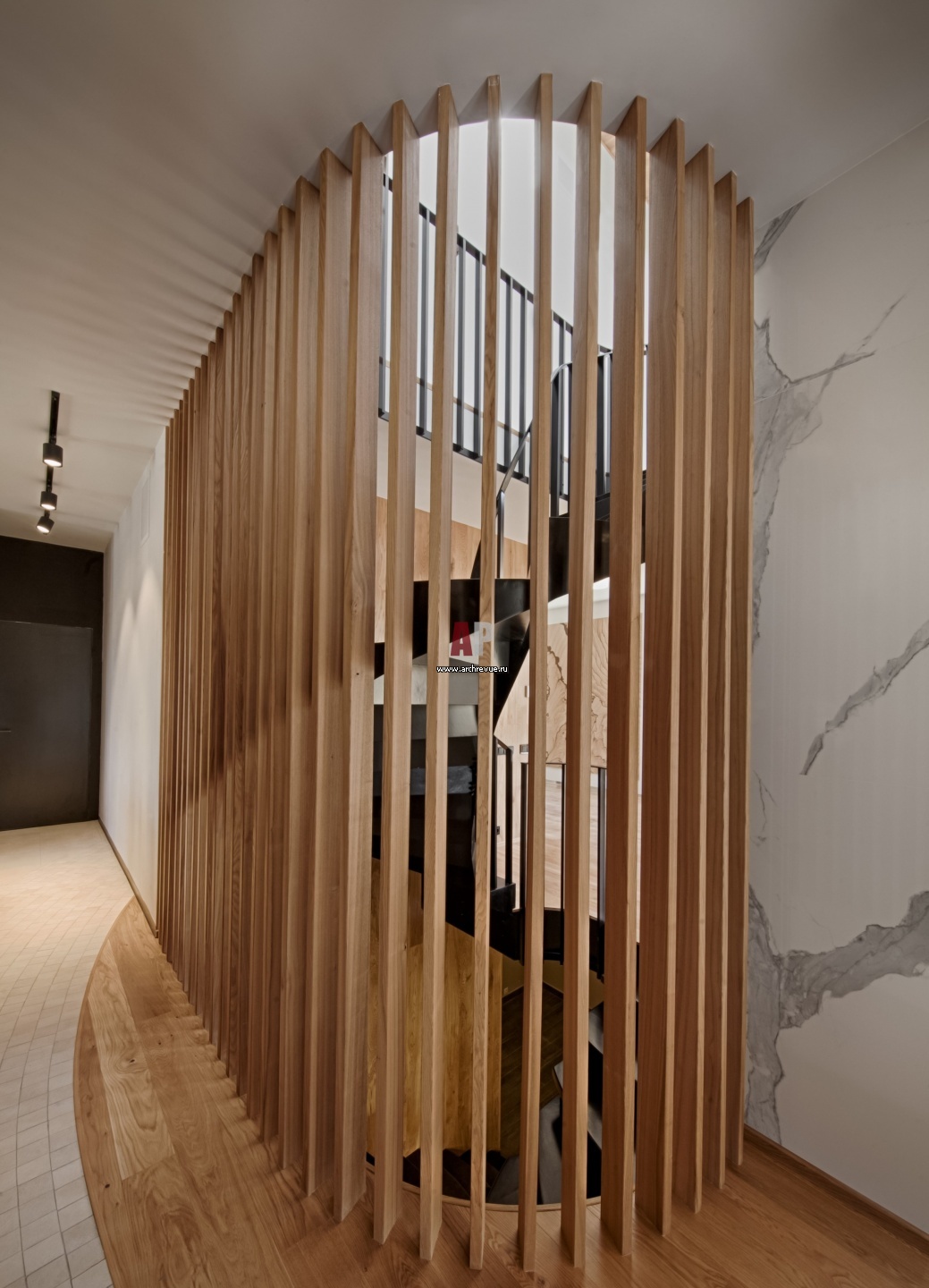 Реечная конструкция, отделяющая лестничный холл, изготовлена из особо прочной термодревесины. Ритму и рисунку деревянной «кулисы» вторят лестничные перила из металлических прутьев. Стена за ней облицована керамогранитом с фактурой каррарского мрамора.