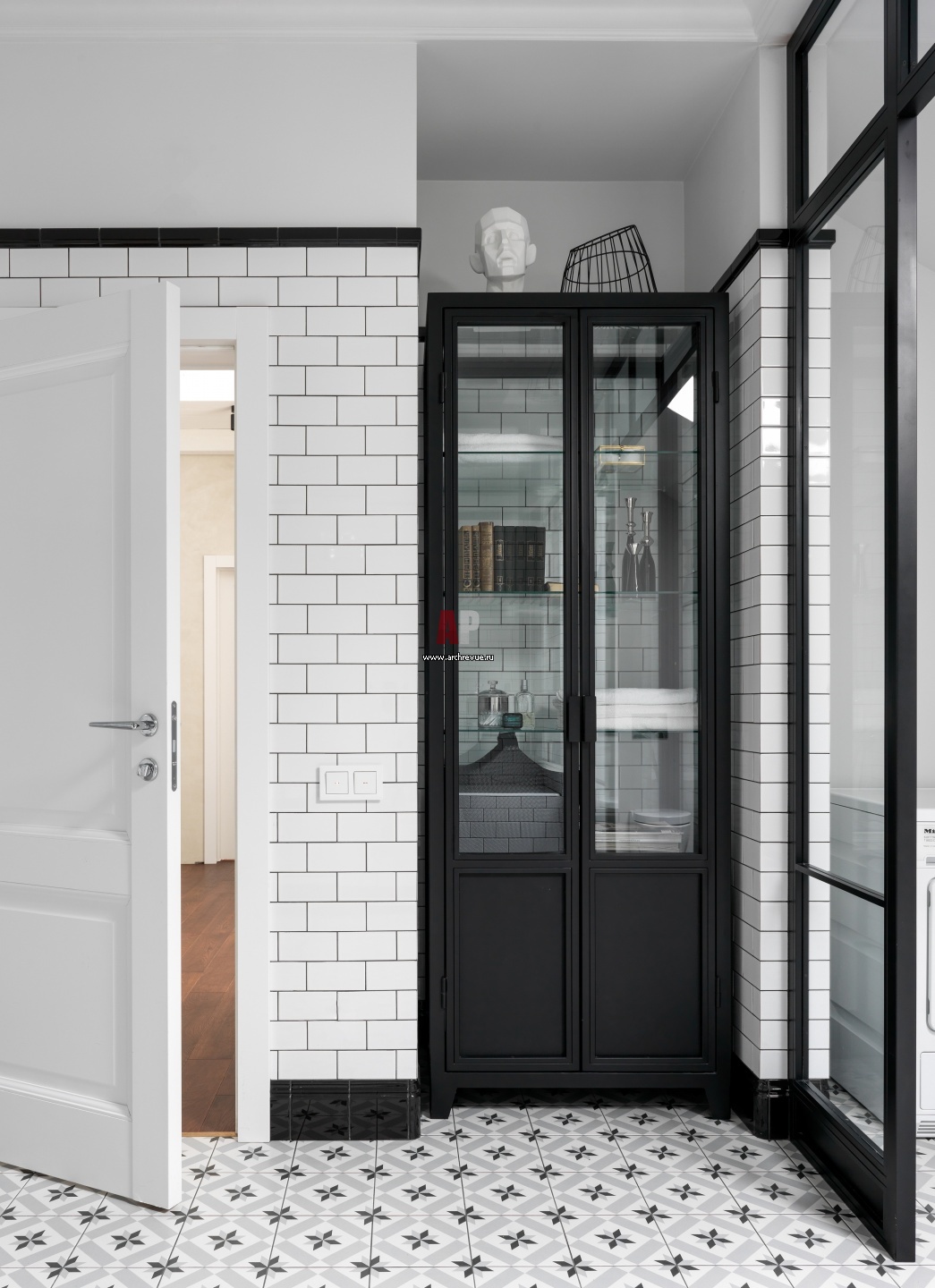 Дом с элементами ретро для отдыха в Подмосковье. Интерьер санузла на втором этаже. Стеклянная перегородка на сварном каркасе из черного металла, шкаф-витрина сделаны на заказ.
