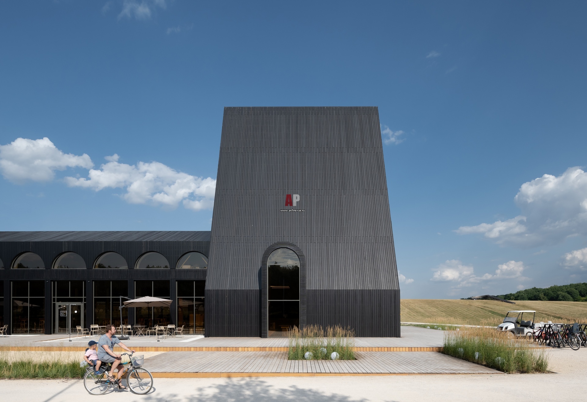 К башне входа примыкает объем с одним нефом – своего рода громадная изба. Это пространство вмещает в себя максимальное количество гостей и служит демократичным кафе.