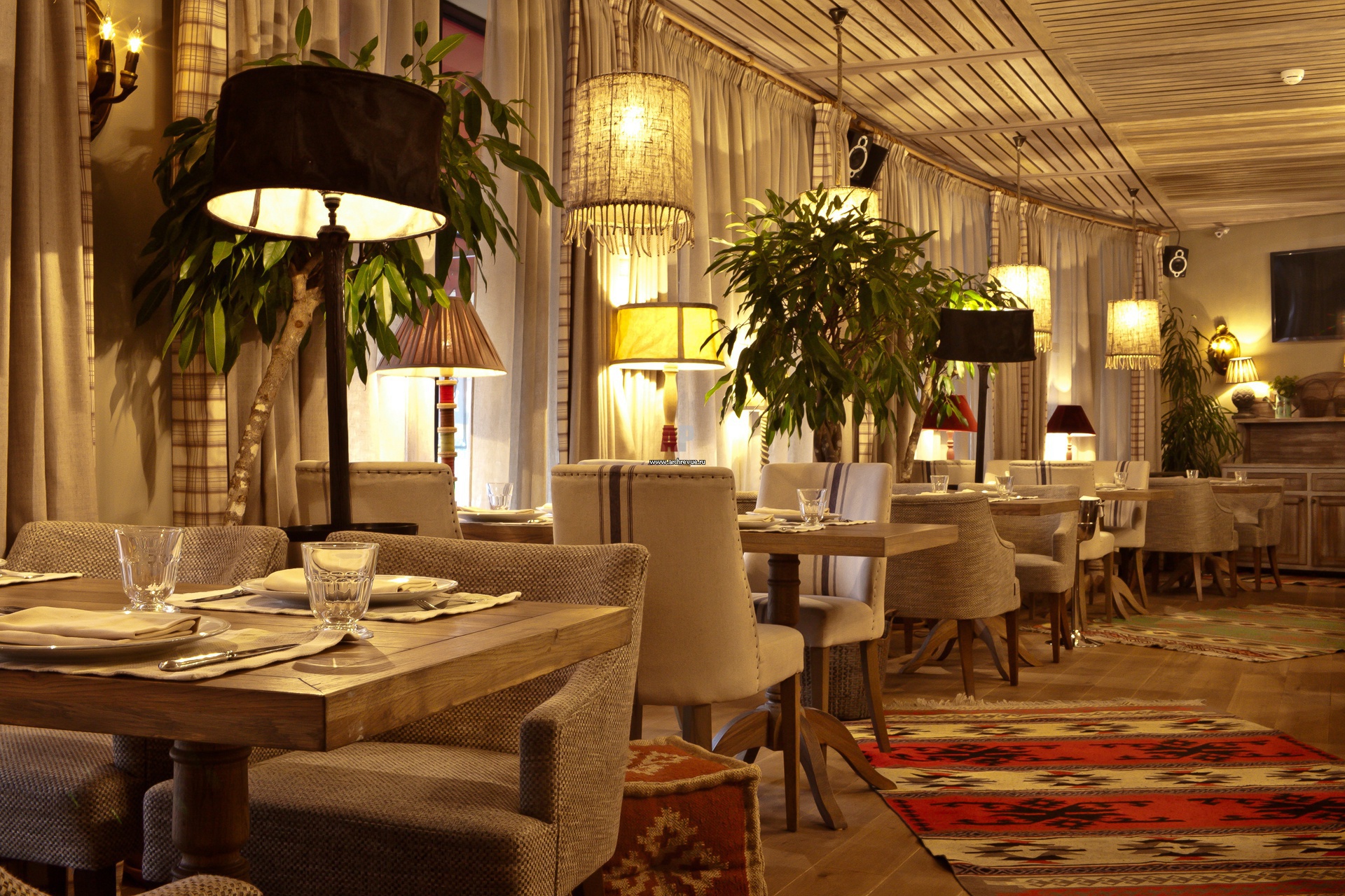 Зал ресторана на подиуме. Потолок зашит доской из лиственницы, над каждым столиком – светильник с холщовым абажуром. Мебель, свет, поставщик NEXXT.