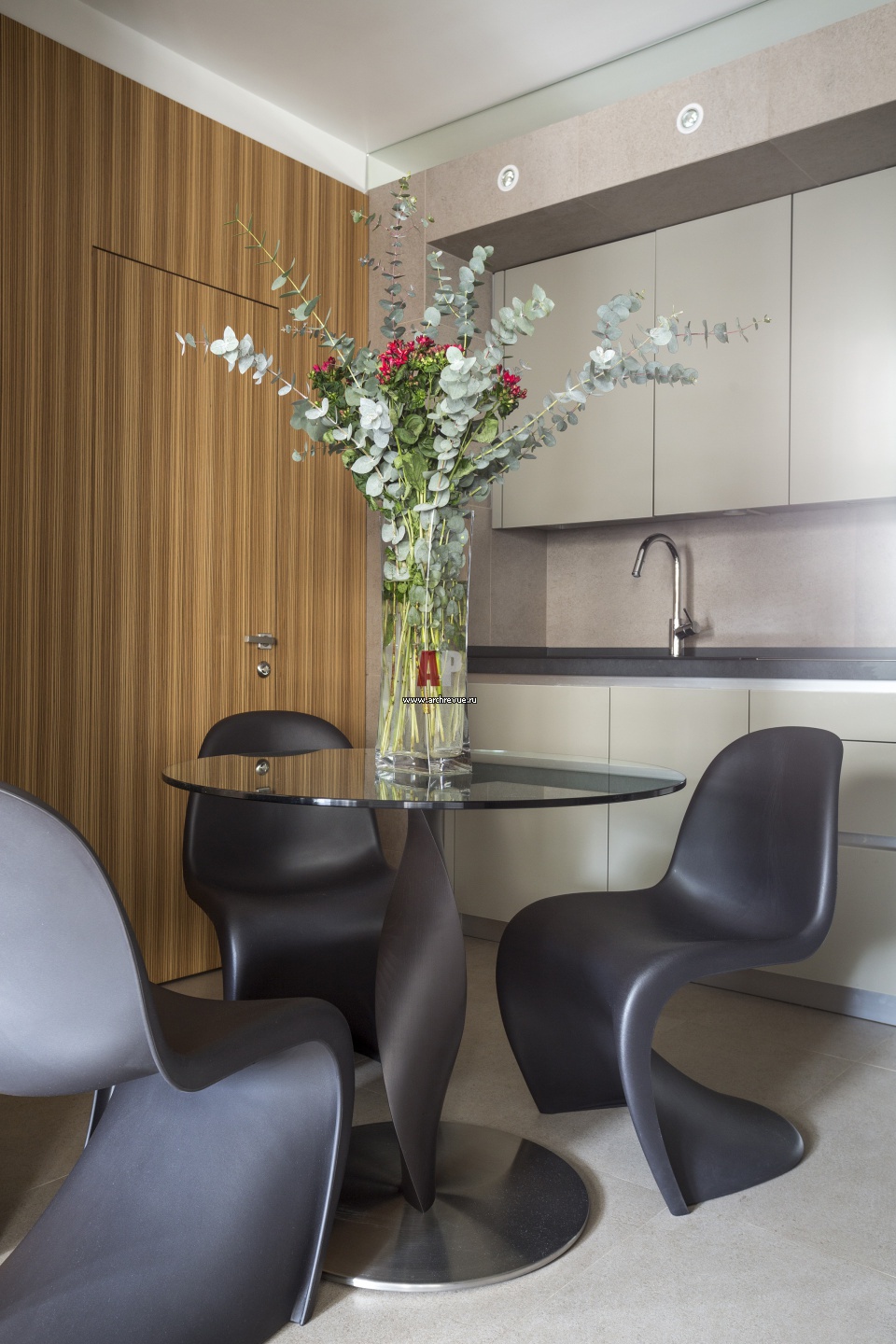 Фото интерьера современной столовой в гостиной-студии. Стол, Porada, модель Spin. Стулья, Vitra, модель Panton Chair.