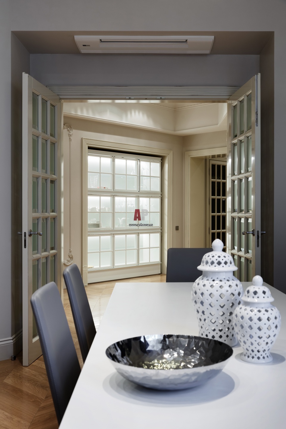 Квартира на стыке классики и современности в историческом доме. Интерьер столовой. Обеденный стол, B&B Italia. Стулья, Bonaldo. Светильник над столом, MOOOI.
