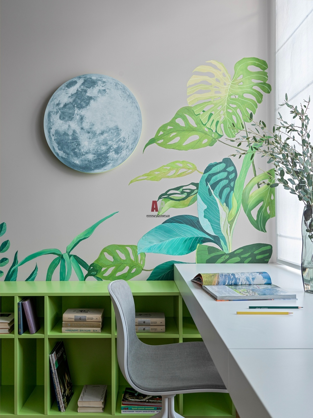 Вдоль окна в детской находится большой стол, за ним удобно делать уроки и заниматься творчеством. Здесь же – удобная система хранения.