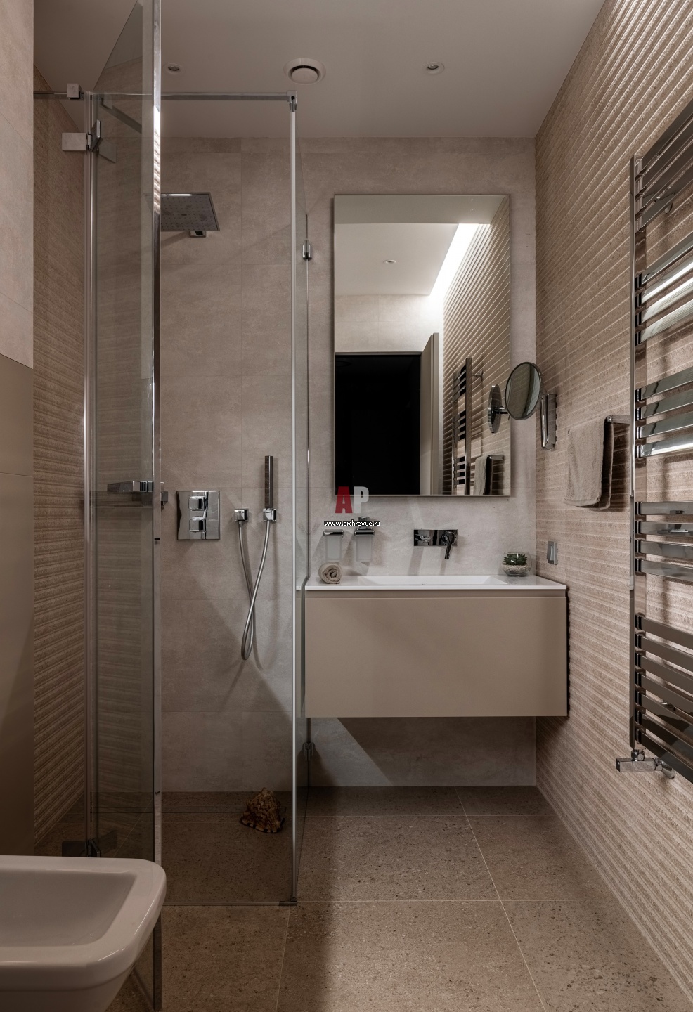 Двухэтажная квартира в современном стиле для семьи с детьми. Детский санузел. Раковина и консоль, кориан, по авторским эскизам.