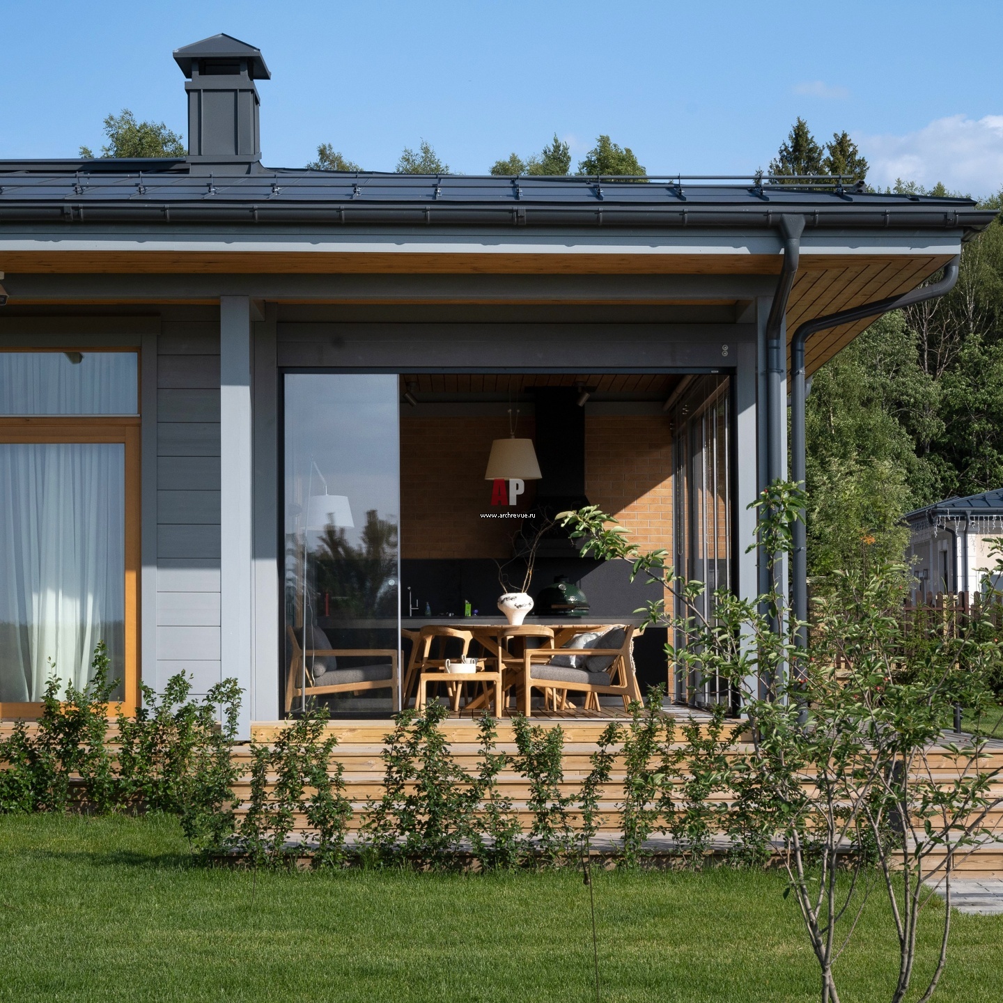 Деревянный дом для большой семьи. Объем дома вытянут по участку, к оному торцу примыкает терраса с летней кухней.