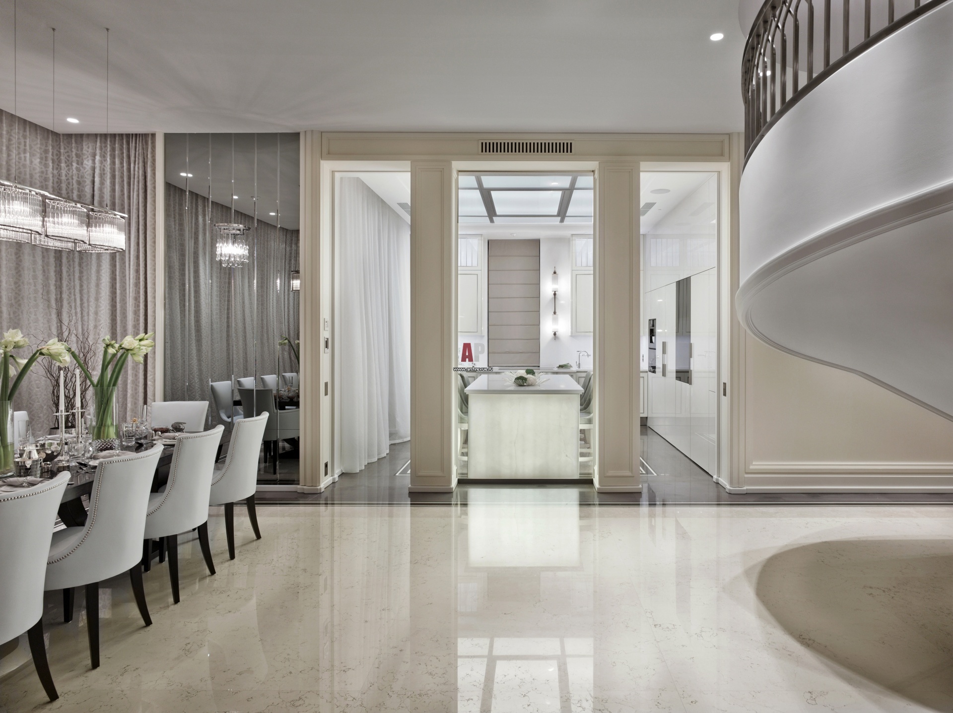 Кухня изолирована от столовой несущими колоннами и стеклянной перегородкой. Кухонный гарнитур в белой гамме, Eggersmann. В лицевую часть кухонного острова, выходящего в гостиную, вмонтирован подсвеченный оникс. Пол первого этажа выстлан четырьмя видами мрамора.