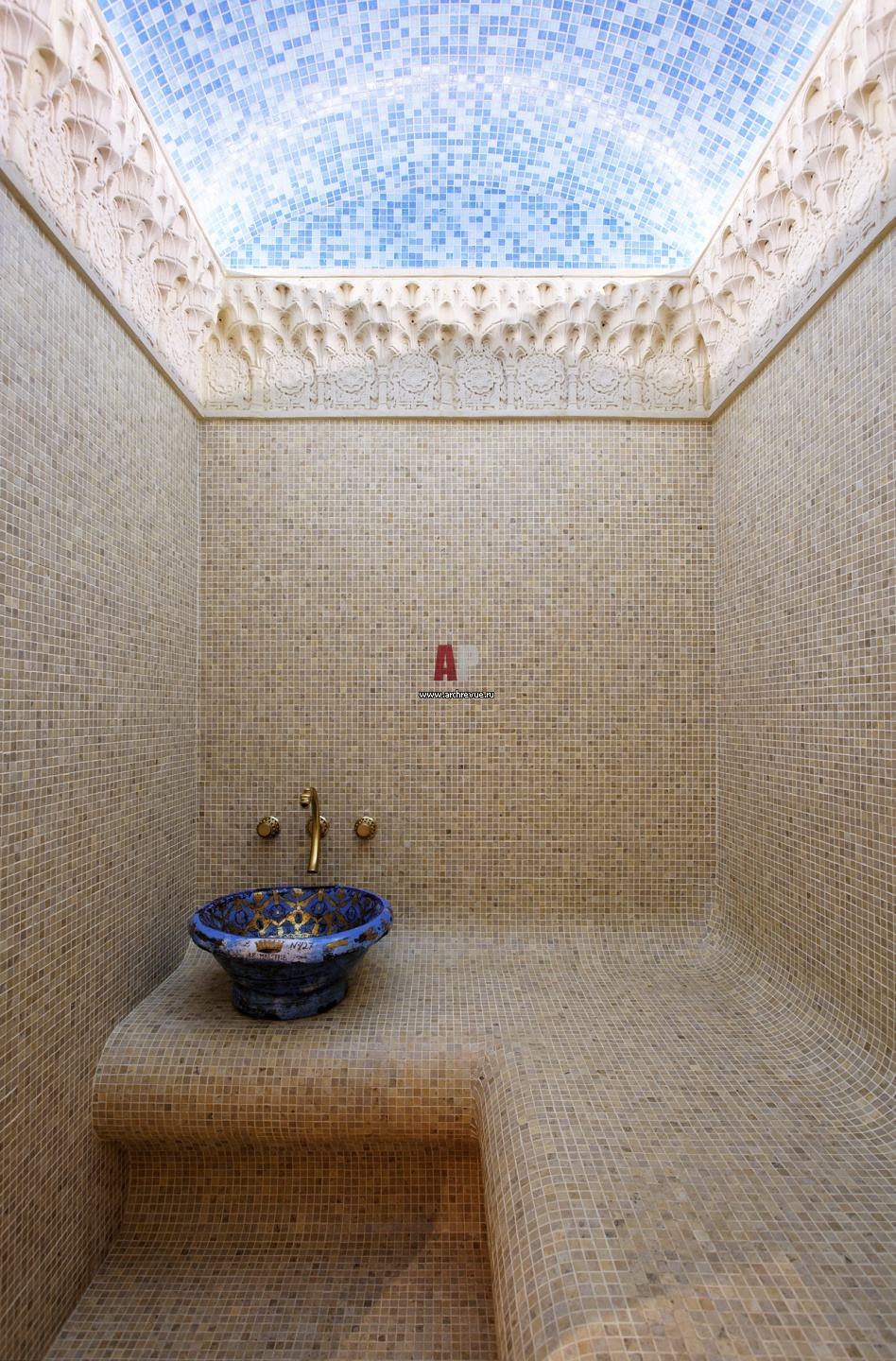 Хаммам решен в классической для этого помещения стилистике. Яркий элемент декора – керамический фриз в традициях арабского зодчества.