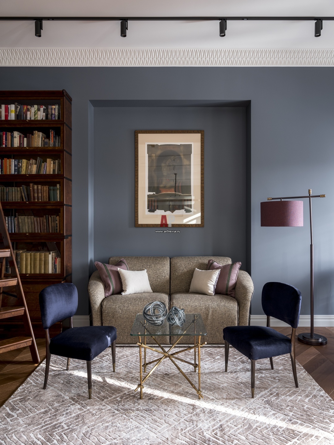 С нишей в кабинете получилась интересная история. Сначала ее хотели оставить кирпичной, но кирпич оказался не оригинальным дореволюционным, тогда его решили заменить на историческую кирпичную плитку. Но в данном пространстве она смотрелась неорганично, поэтому в итоге дизайнер все стены выкрасила однотонной серо-синей краской. Получилось сдержанно и благородно. Диван, Milano Bedding. Стеллаж, Bjorkkvist.