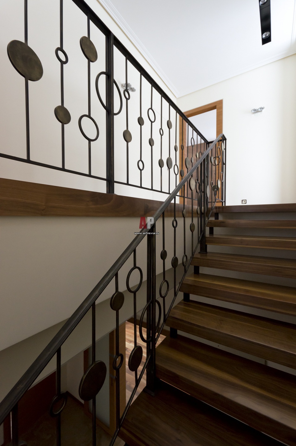 Лестницы решены по металлическим конструкциям. Ограждения из кованого металла с геометрическим рисунком.