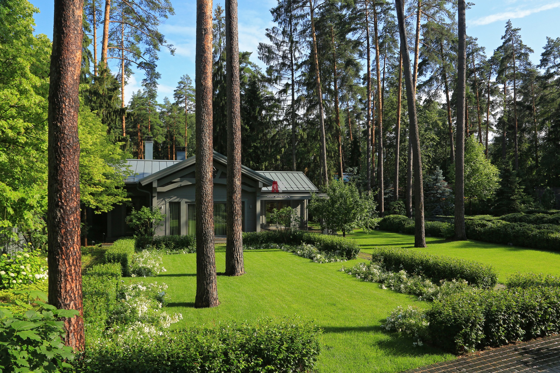 Из хвойных деревьев для оформления участка выбраны проверенные временем и обладающие прекрасными эстетическими характеристиками ель обыкновенная и ель колючая «Глаука». Первый план вдоль гостевого дома создают плодовые деревья: яблони, вишни и сливы.