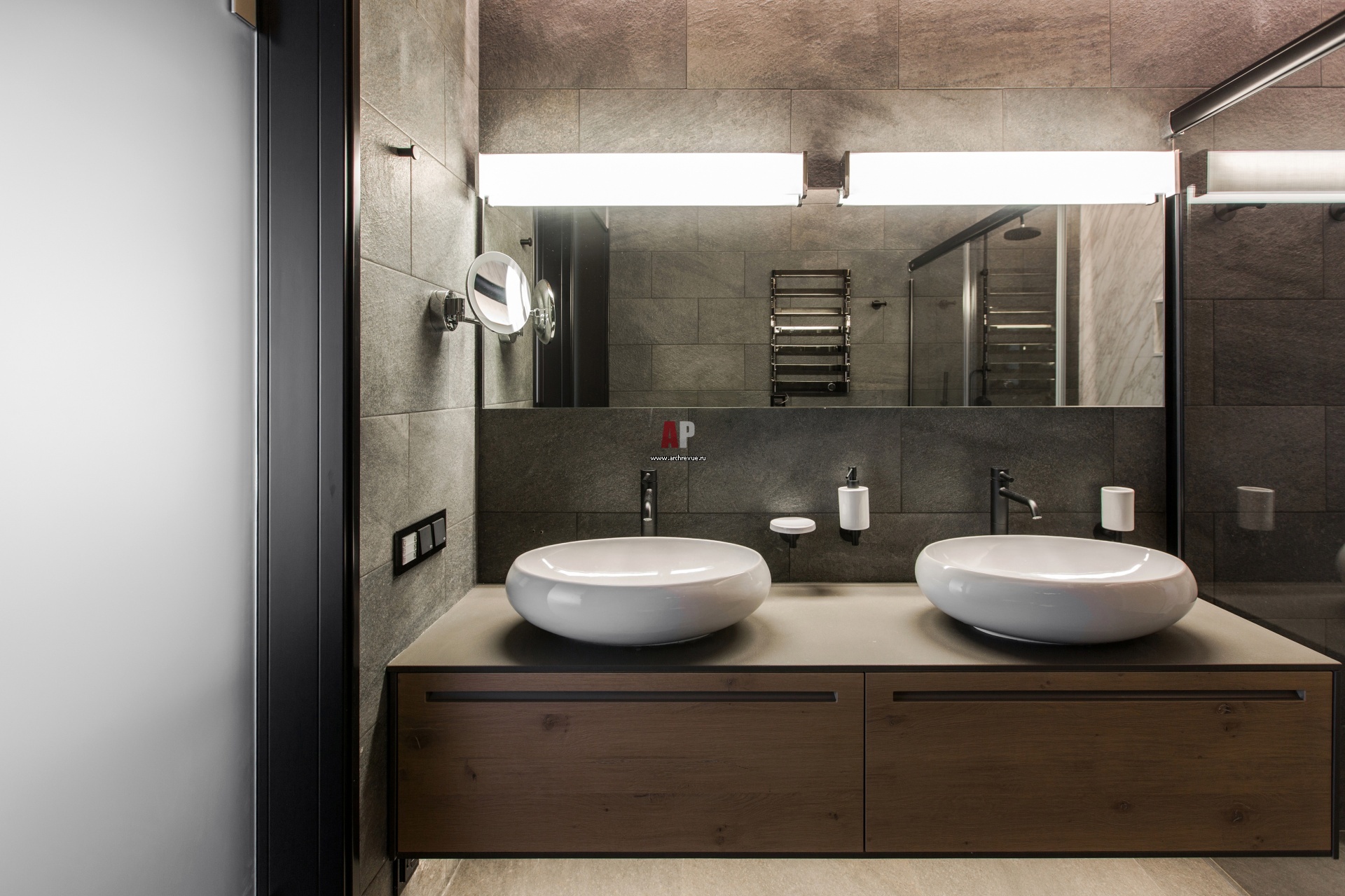 Хозяйский санузел выглядит брутально. В отделке использовано черное дерево и мрамор Volakas Extra.