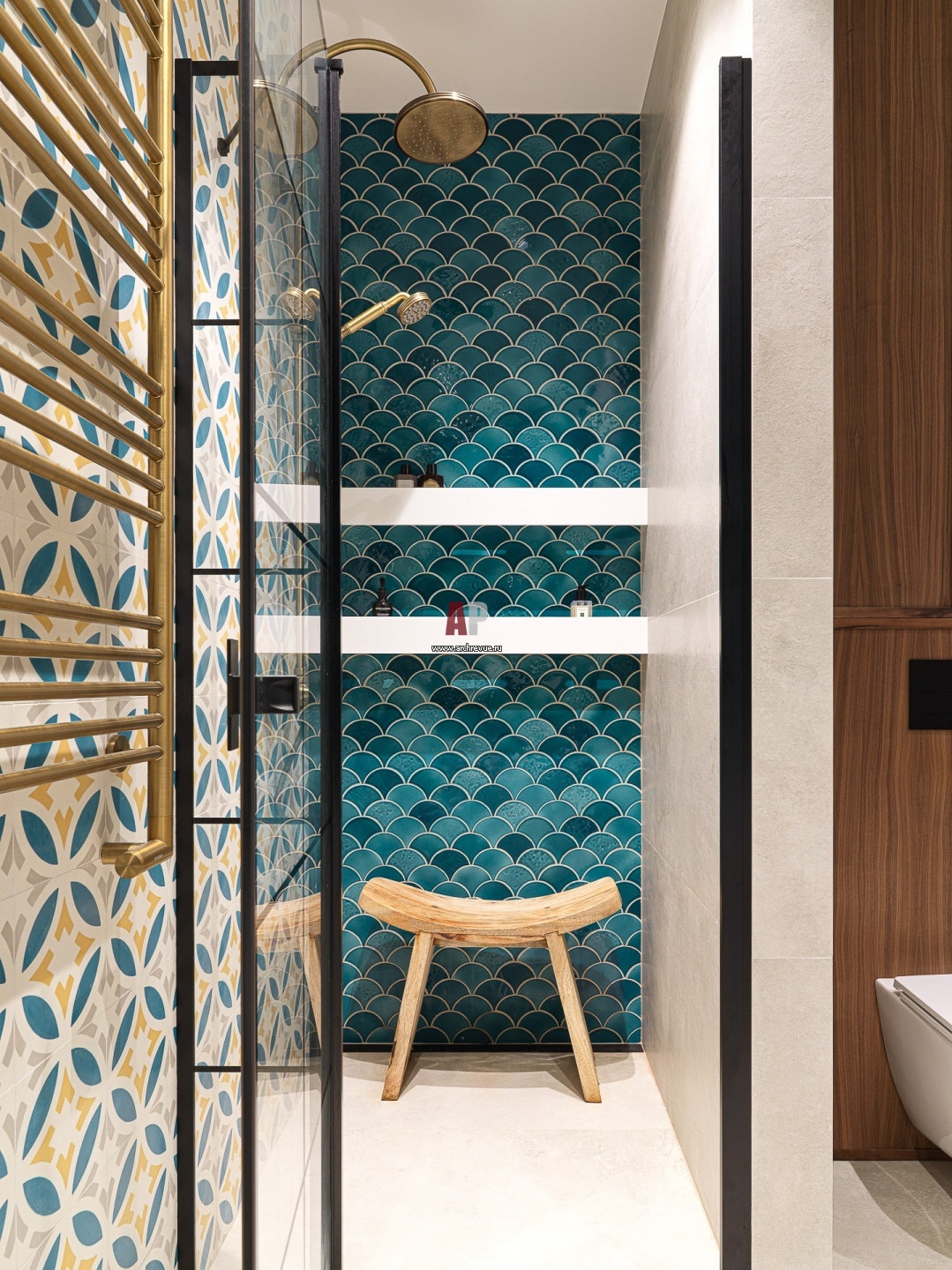 Хозяйская ванная комната. Душевая. Плитка с ярким орнаментом, Cezzle. Плитка под бетон, ItalON.