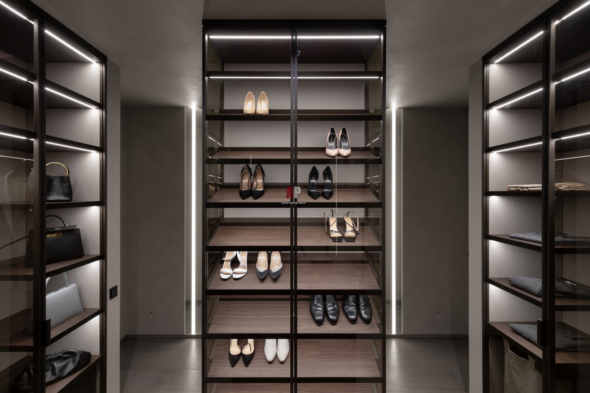 Стеклянная гардеробная примыкает к хозяйской спальне. Мебель сделана на заказ, использован шпон ореха, металлический профиль и тонированное стекло на фасадах.