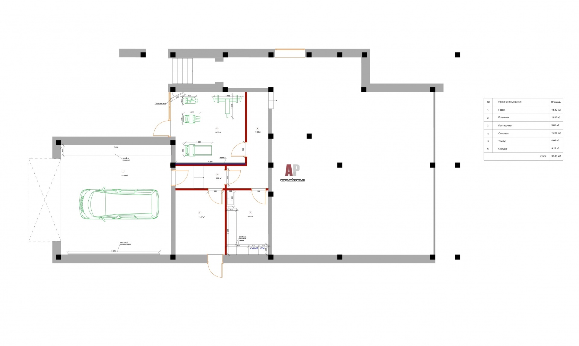 План 1 этажа частного жилого дома с многоуровневой планировкой.