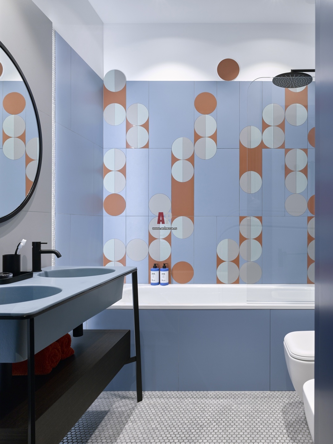 Детский санузел. Рисунок для панно из керамогранита Revigres разработан дизайнером. Подрядчики сделали авторскую нарезку.